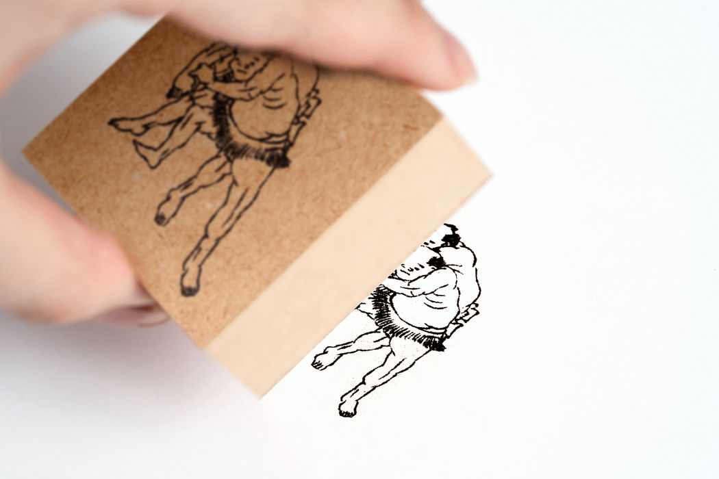 その幕開けを飾るのは、同じく墨田区が生んだ世界的アーティスト・葛飾北斎。『北斎漫画』より、「百面相」と「相撲」のユニークな図版を採用しました。江戸の暮らしや人々を生き生きと描いた北斎の、心豊かな表現力を、繊細なゴム印で再現したコレクションです。